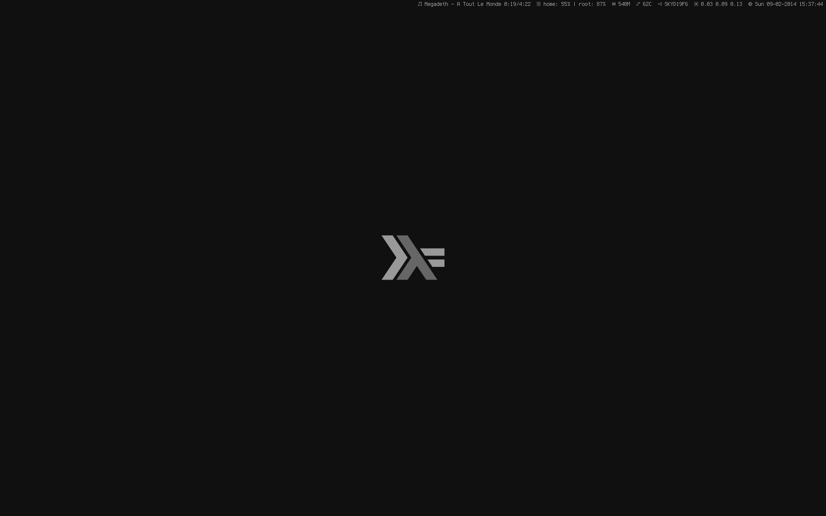 This is what my blank desktop looks like. There isn't much to look at, and I haven't put any fancy conky widgets or anything there because I hardly ever just look at my wallpaper anyway. That's the Haskell logo, it seems as good a logo as any to have on a desktop I never see (other choices include Puffy, Tux and Beastie, all OS logos).