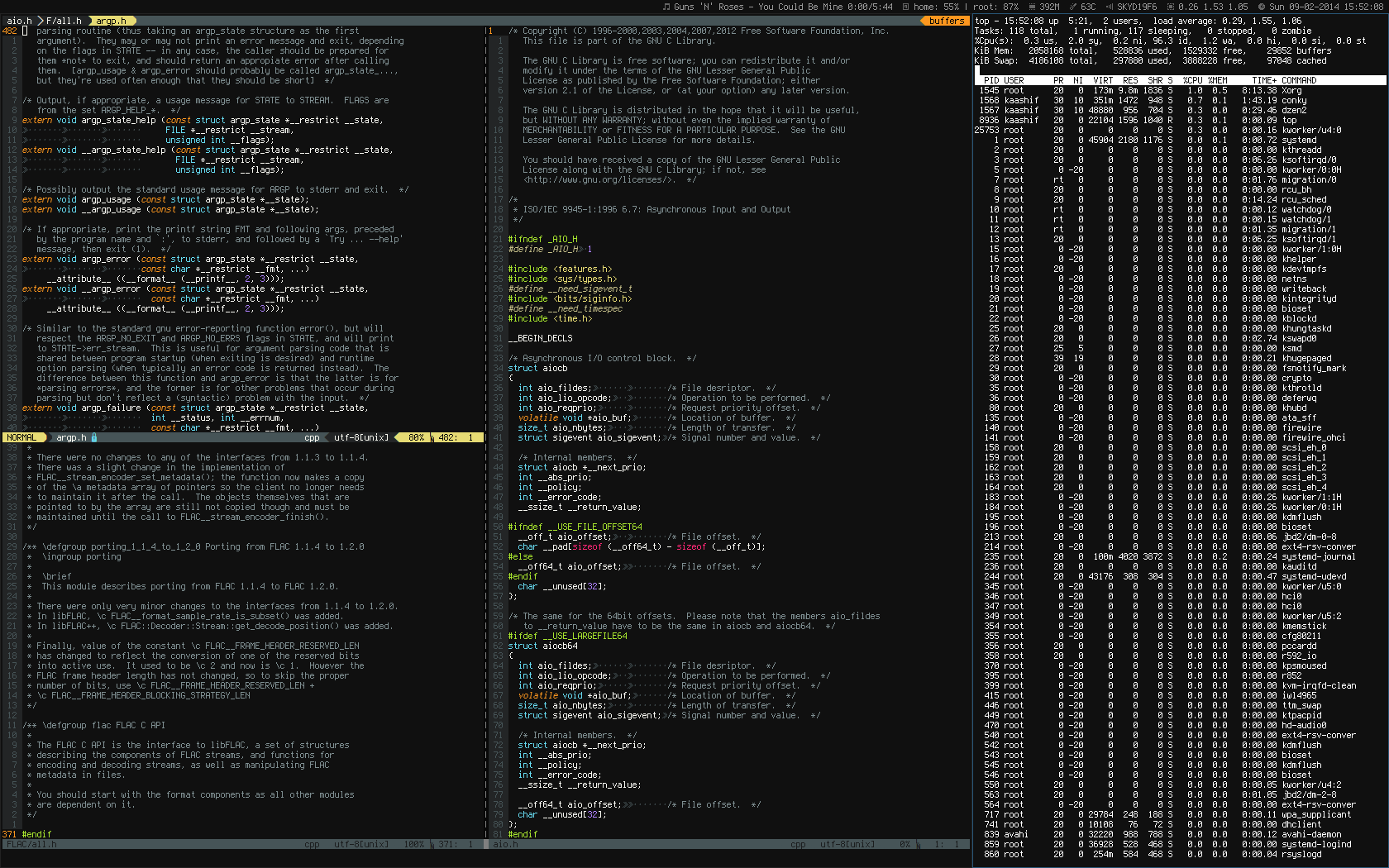I'd like to say this is what my laptop usually looks like, but the reality is that I've just opened some random files in /usr/include with gVim. Well, this might be what a kernel hacker's laptop looks like sometimes - mine is mostly just the one shell script or Haskell program open, and usually a browser with Reddit or 4chan on the side. The window manager is i3, by the way, a WM I like because of its simple and efficient manual tiling - none of that XMonad dynamic crap, way too inflexible and sometimes annoying.