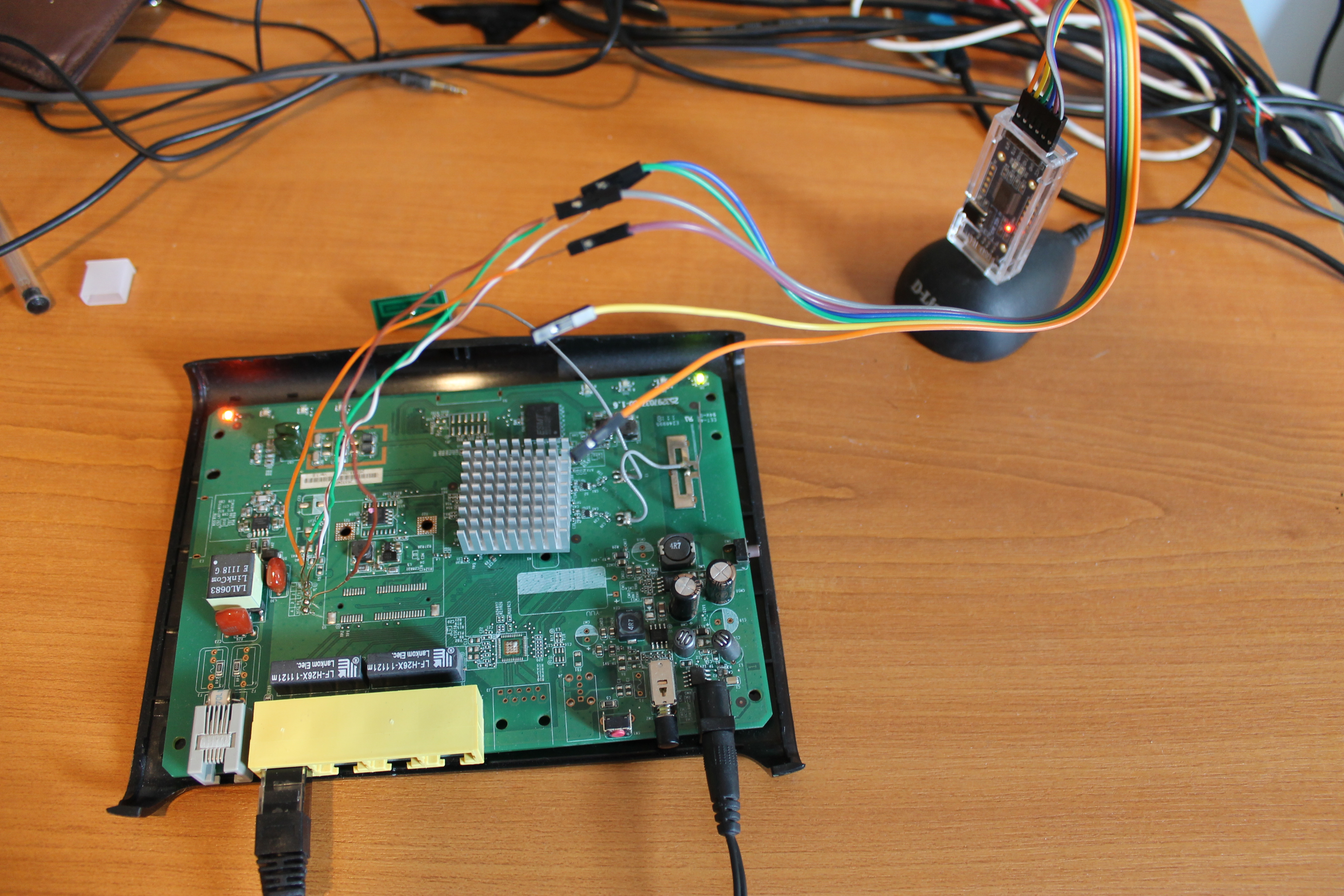 Interestingly, if you set your UART to 5V, you can actually power the whole router from the serial port! I discovered this by accident, I had my FT232 set to 5V and connected it without having power connected to the router. Rather spookily, the router powered on without any power. But this is possibly unsafe, don't do it! Who knows how much current the router needs, it's best to use the barrel jack and a real power supply!